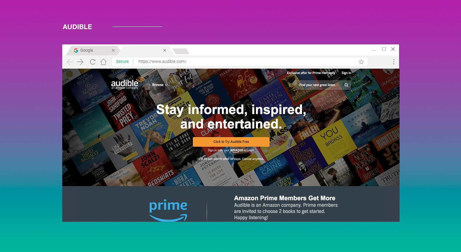 Tiene más de 180.000 libros disponibles en todos los idiomas y con dos tipos de servicio: descarga independiente de cada audiolibro o mediante el pago de una cuota mensual con la que escuchar todos los libros que quieras. Si no estás aún convencido, puedes sumarte al periodo de 15 días de prueba y si eres de Amazon Prime, que sepas que es un servicio al que ya tienes acceso.