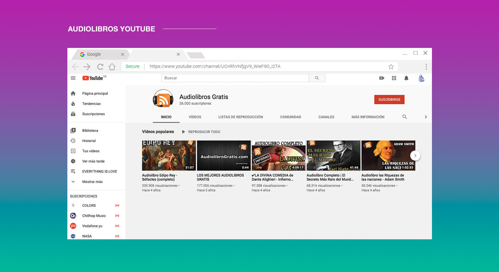 No tiene un servicio propio, pero sí su propio canal de audiolibros gratuito con 28.000 suscriptores.