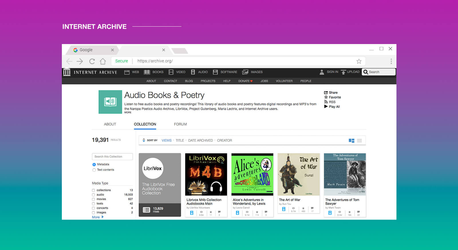 Como su nombre indica, se trata de un archivo de audios, pero contiene más de 11.000 audiolibros de obras de dominio público o en licencia Creative Commons.