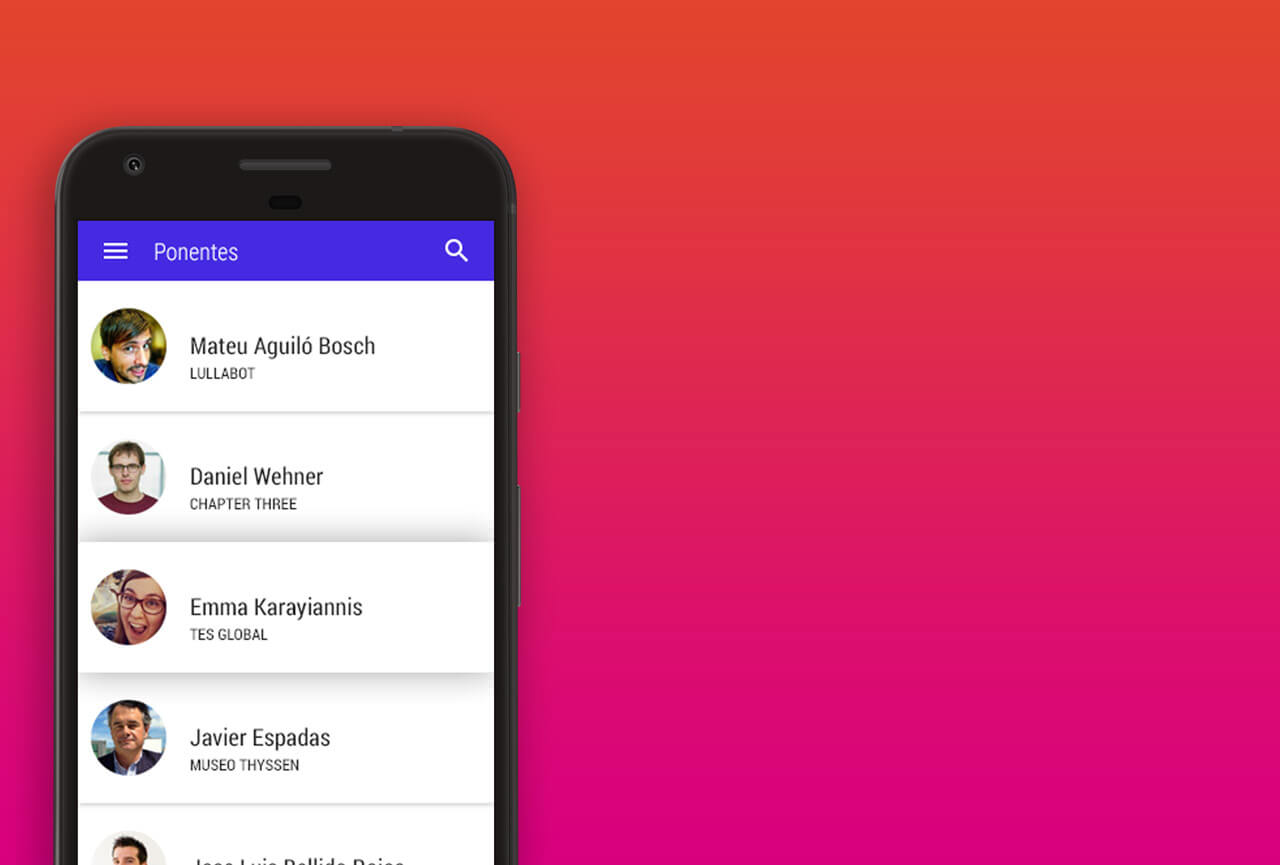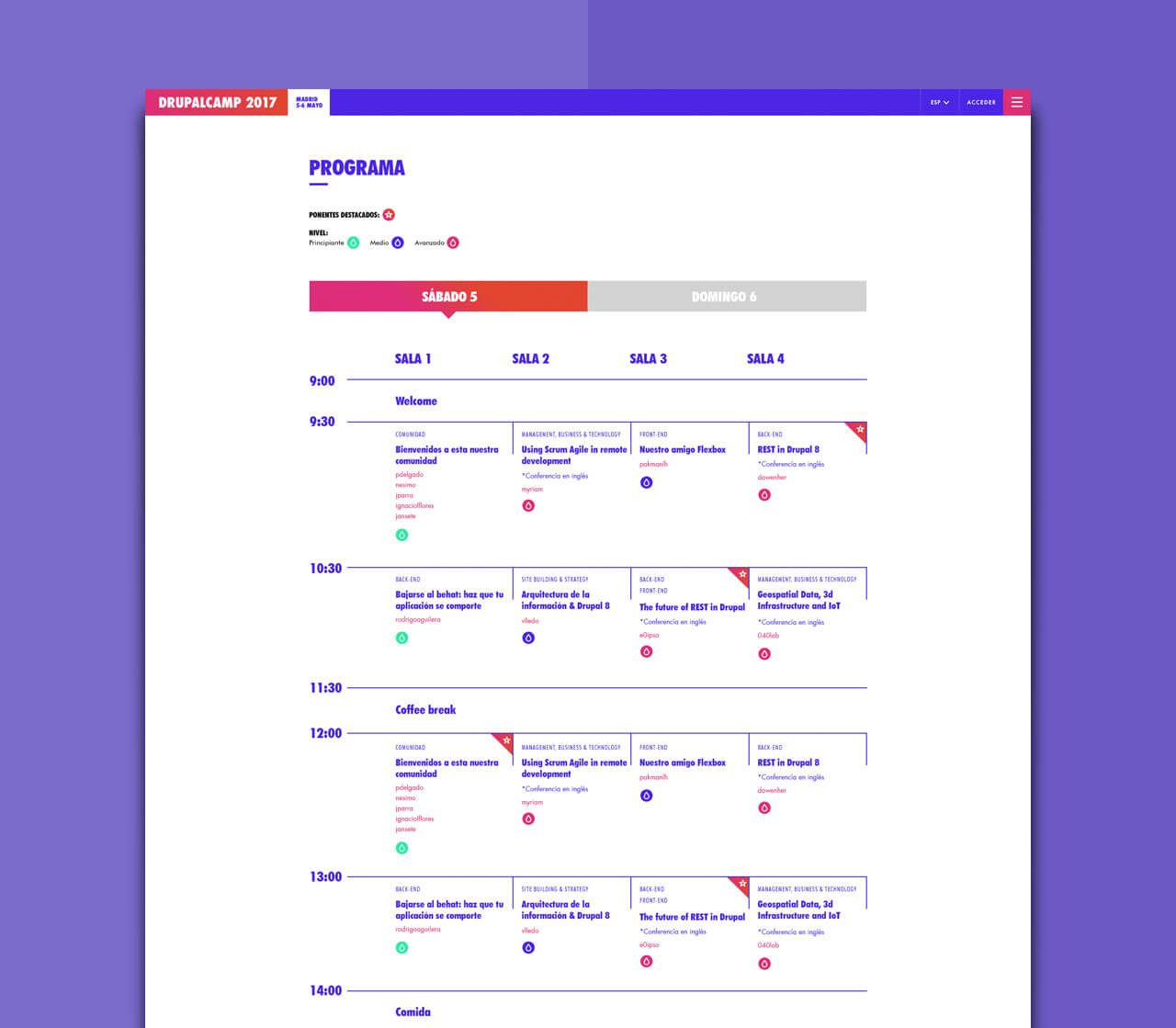 El color predominante, que se asocia a la marca Drupal, es el azul, que decidimos acompañarlo siempre de un degradado, entre el fucsia y el coral, para seguir la estela del concepto principal.
