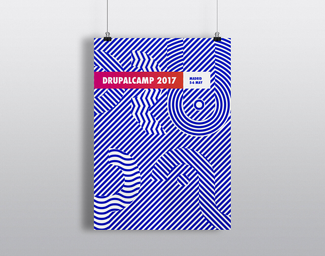 Las letras de la palabra “DRUPAL” aparecen dispersas en el fondo utilizando patrones de líneas distintos del mismo color que gracias a su contraste generan efectos visuales de movimiento. Con esto quisimos representar la heterogeneidad y pluralidad de la comunidad, en la que los diversos perfiles y espacio de discusión permiten que se fomenta constantemente la participación.