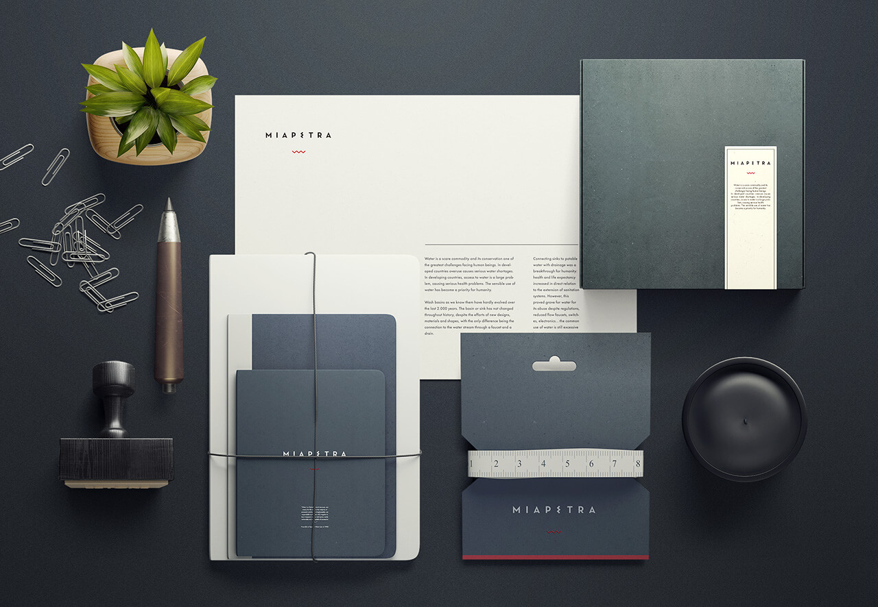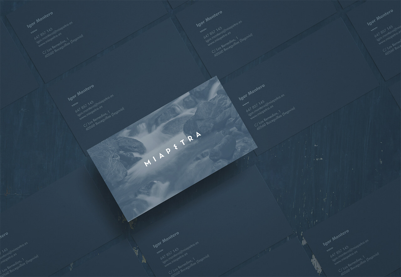 Quisimos una gama de colores limitada pero que le diese a la marca una característica elegante, lujosa y atemporal. Utilizamos el gris azulado que contrasta con los tonos terrosos y blancos de los diferentes materiales utilizados por Miapetra.